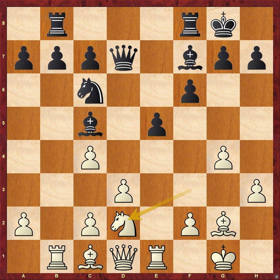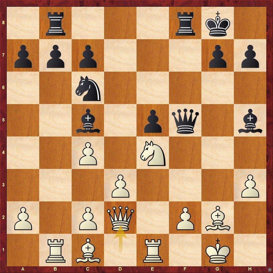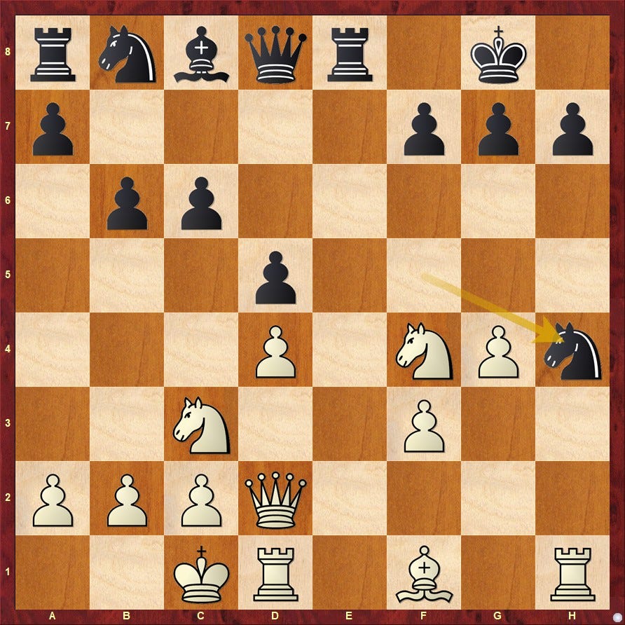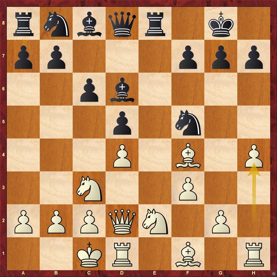 15..f5!? De scherpste voortzetting, waarachter redelijk wat rekenwerk schuilgaat. 16.exf5 ♕xf5 Spectaculaire alternatieven kosten te veel materiaal, na bijvoorbeeld 16..♗xf2+?? 17.♔xf2 ♖xf5+ 18.♕xf5 ♕xf5+ 19.♔g1 wint wit makkelijk. 17.♘e4 ♗h5? De logica zelve, maar vanuit praktisch oogpunt misschien reeds de verliezende zet. Na het veel sterkere 17..♗e6 18.♔h2 is de stelling dynamisch gebalanceerd. 18.♕d2