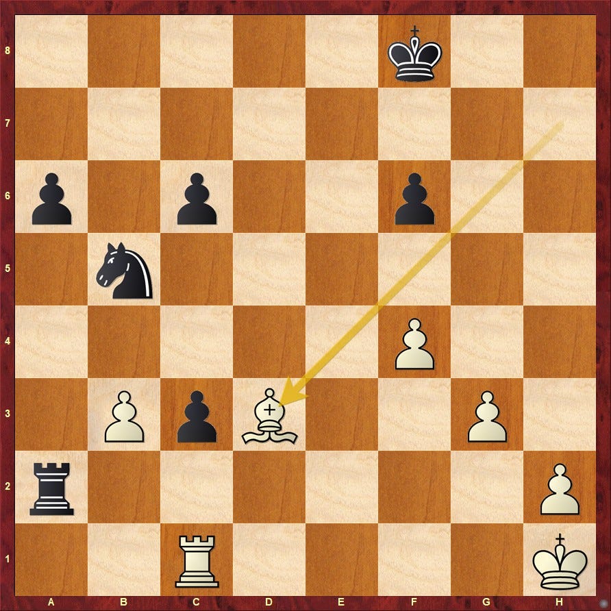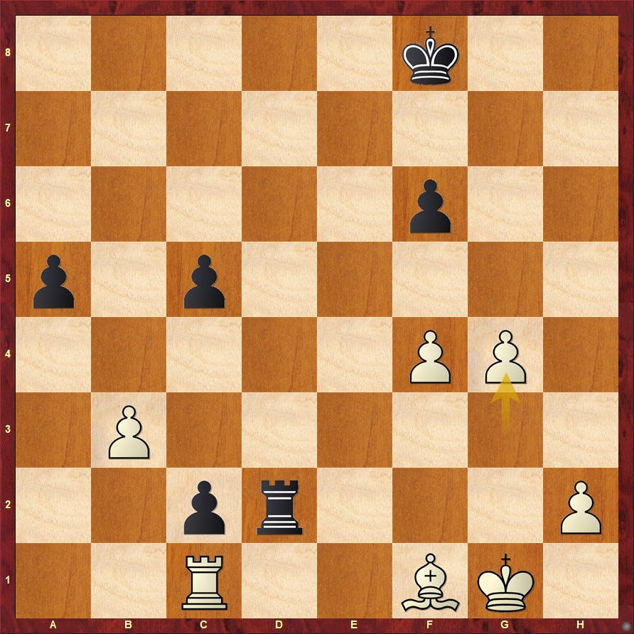 31..♖d2!? 32.♗xb5 c2 33.♗f1 Wit staat een vol stuk voor, maar al zijn stukken staan bevroren op de onderste rij. Dat wil niet zeggen dat zwart bij de pakken kan blijven zitten, want wit kan in de komende zetten verbonden vrijpionnen maken op de koningsvleugel. 33..a5 34.♔g1 c5 35.g4 Nu de witte pionnen aan hun opmars zijn begonnen, is het kritieke moment in dit bijzondere eindspel aangebroken.