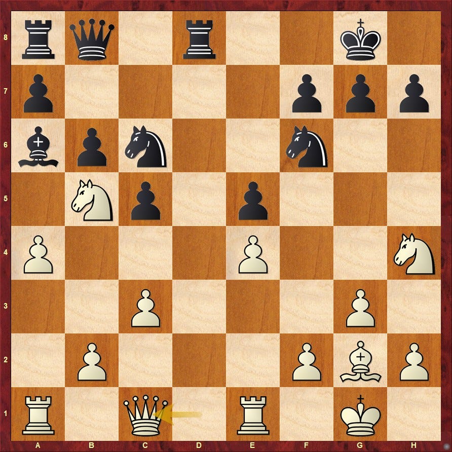 Op het eerste gezicht heeft zwart een aantrekkelijke actieve stelling, maar er zijn concrete tactische problemen. Wit dreigt niet alleen de zwartveldige loper te slaan, want ook de witveldige loper komt in de problemen na bijvoorbeeld 18..♗e7? 19.♘g3 ♕g6 20.♗xc6! bxc6 21.♖xb8 ♖xb8 22.♖xe5 met stukwinst. De enige voortzetting die de partij niet in een beslissende plooi legt, is 18..♗d6 19.♘g3 ♕g6 20.♗e4 ♘d4! 21.♗xg6 ♘f3+ 22.♔g2 ♘xd2 23.♗xh7+ ♔xh7 24.♗xd2 met prima kansen voor wit om zijn pluspion ten gelde te maken in het eindspel.